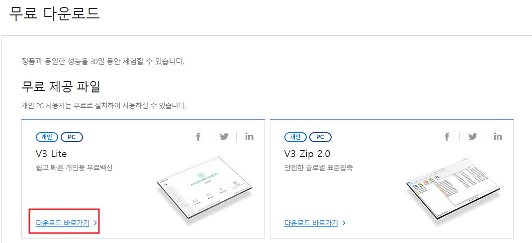 무료 제공 파일에 있는 "V3 Lite" 를 찾으신 후 "다운로드 바로가기" 를 클릭해줍니다