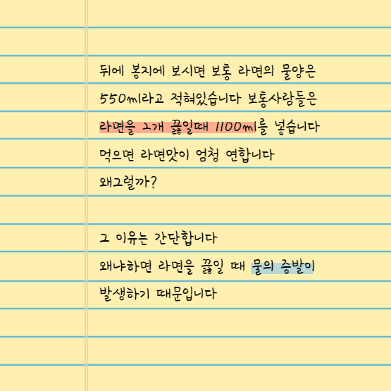 물의 증발이 발생하기 위해서는 라면의 물이 적을 수록 열의 발생률이 높기 때문에 증발이 증가하지만 라면의 물이 많게 되면 열의 발생률이 낮아지게 되면서 증발량이 감소한다고 합니다 그렇기 때문에 라면의 물을 끓일 때 550ml x 2 = 1100ml가 아닌 880ml가 적당하다고 합니다